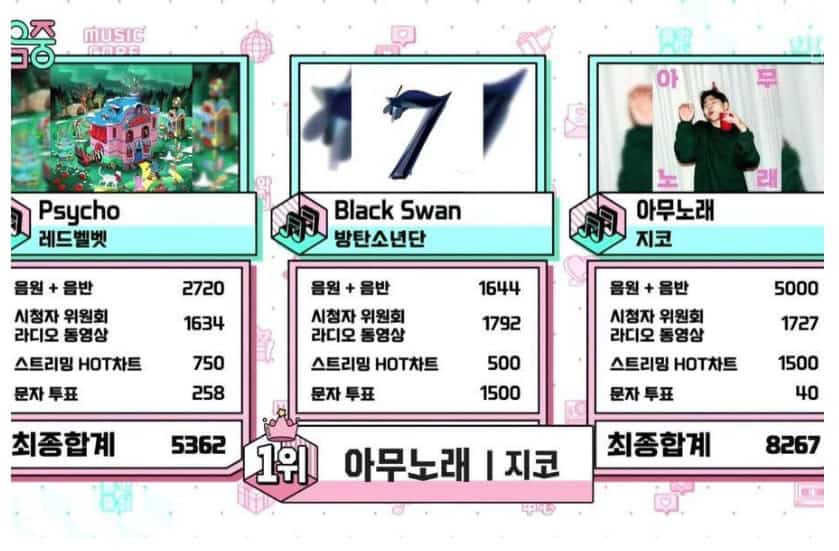 MBC’nin “Music Core” programının 1 Şubat bölümünde Red Velvet’in “Psycho”suna karşı BTS’in “Black Swan” ve Block B’den Zico’nun “Any Song”u yarıştı. Red Velvet 5,362 puanla 3. olurken, BTS 5,436 puanla 2. oldu.