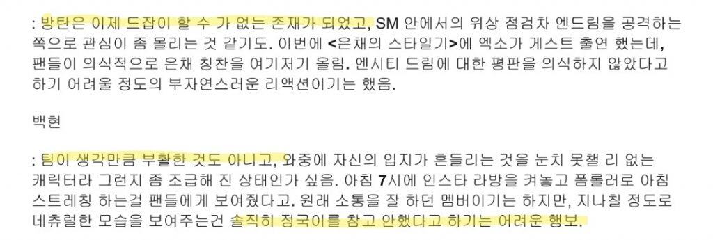 BTS‘in ulaşılmaz bir konuma gelmesiyle birlikte, SM Entertainment içindeki statülerini yeniden değerlendirmek için NCT Dream‘i hedef alma eğiliminin arttığı görülüyor. Son zamanlarda EXO‘nun Eunchae’s Star Diary programına konuk olması ve hayranların Eunchae hakkında bilinçli bir şekilde övgü dolu yorumlar yapması dikkat çekti.