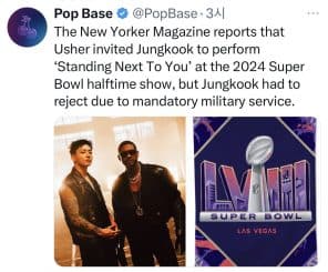 BTS‘den Jung Kook‘a bu yıl Super Bowl‘da performans sergileme teklifi yapıldığı ancak askeri hizmeti nedeniyle bu teklifin gerçekleşemediği bildirildi. İddialara göre, Usher‘ın Super Bowl performansı sırasında Jung Kook‘a iş birliği