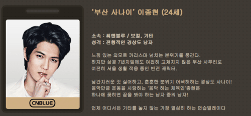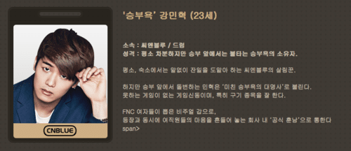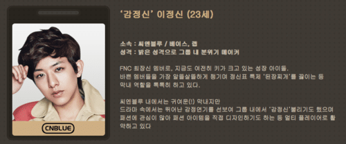 Dizi de duygusal bir oyunculuk gösteren CNBLUE’nun sevimli maknae’sı. Ona üyeler arasında kamjongshin (duygusal) diye hitap edilir. Bir oyuncu olmasının yanı sıra modaya büyük ilgisi olan, kendi moda ürünlerini tasarlayan biridir.