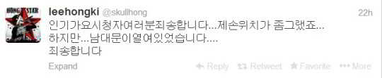 8 Aralık günü, F.T Island’ın lider vokali Lee Hong Ki, Twitter hesabından, ”Bütün Inkigayo izleyicilerinden özür dilerim. Sahnede, elimin duruşu biraz garipti değil mi? Elimi o şekilde tuttum çünkü pantolonumun fermuarı açık kalmış.” yazısını paylaştı.