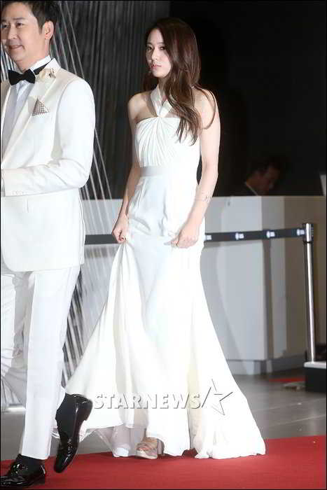 Sung Yuri bir değil iki tane beyaz elbise giydi. İlki arka tarafından gözüken siyah bantlar (Zayıflatma etkisi olan ama Sung Yuri’nin ihtiyacı olmayan bir şey) ile modern omuzları açık bir elbiseydi.