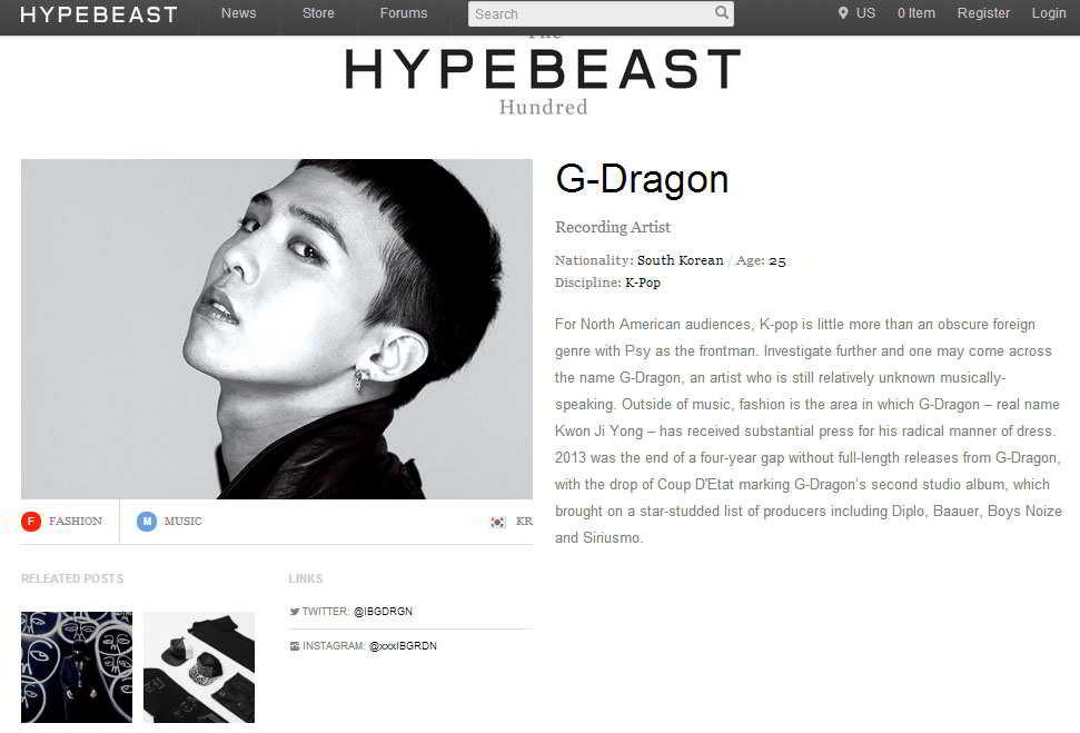 G-Dragon Hypebeast.com tarafından yapılan”Hypebeast Yüz” listesine giren iki Koreli’den biri. Diğeri ise Samsung başkanı Lee Kun Hee. Hypebeat kendi sözleriyle, “Görsel ilham ve bilginin sağlanması yolunda modada ilerleme odaklı bir web sitesi”