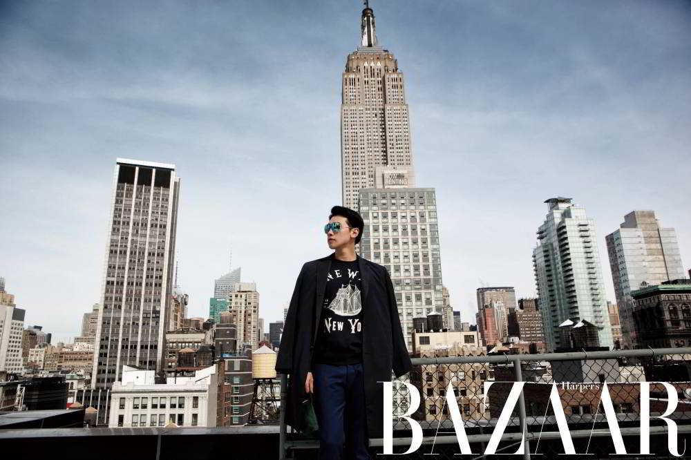 Rain New York şehrinde sempatik bir bekar pozları verdi ve uygun fiyatlı marka H&M‘den bu sezonun en son trendlerini giydi. Heykel yüzünü ve uzun boyunu, arka plandaki uzun gökdelenlerin arasından sergiledi.