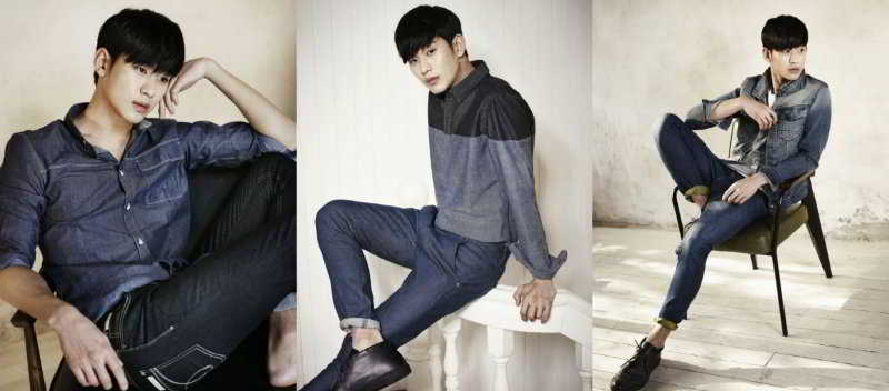 Fotoğraflardan birinde Kim Soo Hyun içi sarı kot pantolonunun aşağı doğru daralan paçalarını kıvırmış. Bu şekilde süper ince vücudu çivit mavisi kot içinde iyi uyum sağlamış. Kotonu yine mavi bir kot ceket ve içine giydiği urban tarzda bir t-shirt ile tamamlamış.
