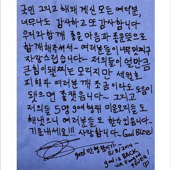 g.o.d grubu uzun süreden sonra yaptığı geri dönüş ile hız başarı yakaladı.Park Joon Hyung ise kendi el yazısı ile instagram hesabında bunu paylaşıp ”Herkese teşekkür ederim yeniden teşekkürler!Sizi seviyorum!Güçlü olun!Tanrı Sizinle Olsun!#god #지오디 #Korea#ThankYou #Sewol호Support.”