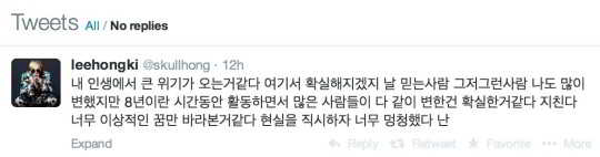 FTISLAND’dan Hongki, Twitter’a insanları yazdığının içerdiği anlam konusunda merakta bırakan, gizemli ama bir o kadar da ciddi bir mesaj bıraktı. 11 Mayıs’ta, lider vokal, Twitter’a “ Hayatımda büyük bir krizin yoluma çıktığını hissediyorum. Bu durum, kim bana inanıyorsa, kim ne düşünüyorsa hepsini netleştirecek . Biliyorum, çok değiştim fakat 8 yıllık faaliyetten sonra birçok insanda değişti. Ben yoruldum. Sanki mükemmel bir rüyaya bakmışım gibi hissediyorum. Gerçeğe çıplak gözle baktığımdaysa ne kadar aptal olduğumu fark ettim” yazmış.