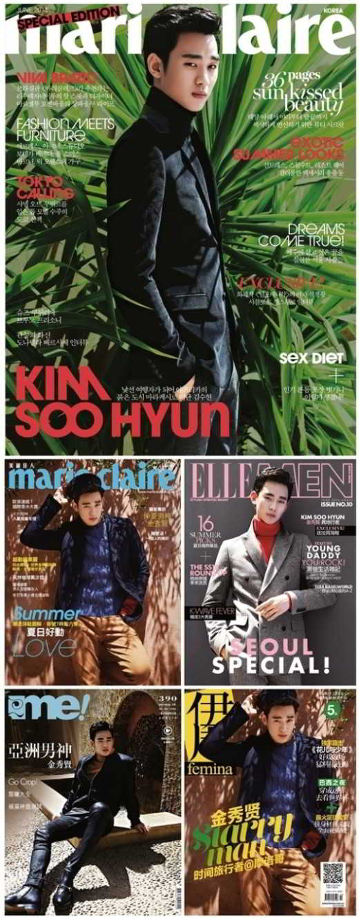 Marie Claire Kore, Marie Claire Tayvan, Elle Man Hong Kong, Me Hong Kong ve Femina Çin, Haziran sayıları için Kim Soo Hyun’u kapak modelleri olarak seçti. Her biri “ Kim Soo Hyun Asya Projesi” nin bir parçası olarak aynı anda foto çekimi ve röportajlar düzenledi.