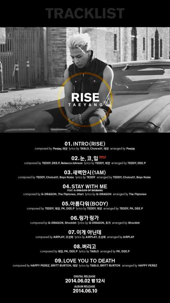 YG-LIFE bloğuna yazan Yang Hyun Suk’a göre; Taeyang ‘SOLAR’ albümünden, 4 yıl aradan sonra çıkacak olan RISE, 9 şarkıdan oluşacak. Taeyang solo albümü için 20 şarkı kaydetti, ama aralarından en iyisi olan 9 şarkı seçildi. Ana başlık parçası olara ise ”Eyes,Nose,Lips” şarkısına klip çekilecek.