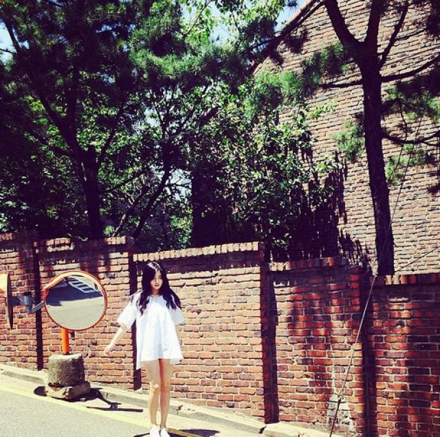 Fotoğrafta,HyunA sevimli bir beyaz mini elbise giydi ve sevimli bir şekilde poz verdi.Onun beyaz teni ve uzun zayıf bacakları göze çarpıyordu.