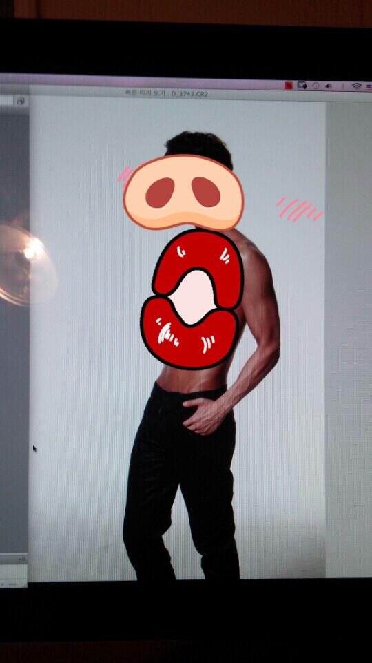 Mükkemmel ve kaslı bir fiziğe sahip olan adamın fotoğrafı gözüküyor fakat o, onun gövdesini dudak, yüzünü de domuz burnu çıkartmasıyla kapatmış.