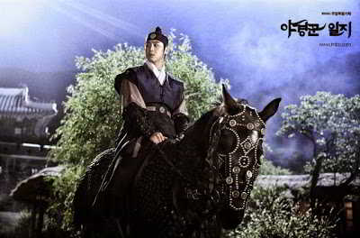 Resimler geleneksel Kore giyimli atın üstüne çıkmış cesur ve yakışıklı idolü göstermektedir.