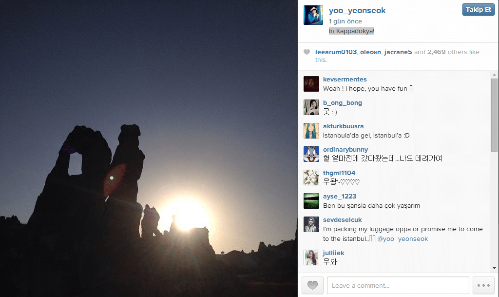 Gu Family Book,Reply 1994 gibi dizilerdende tanıdığımız Yoo Yeon Seok dün Instagram hesabından ” In Kappadokya!” yazarak paylaştığı fotoğrafında Türkiyede olduğunu belirtmiş oldu.