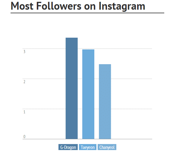 Instagram ise başlı başına başka bir hikaye. G-Dragon adı altında Big Bang en çok takipçi sayısıyşa bu kulvarda ilk sırada yer alıyor. Hatta GD tüm dünyadaki milyonlarca Instagrammers’ın olduğu bir alanda 83. olarak ”Top 100 Instagrammers” arasına girerek inanılmaz bir başarıya nail oldu. Girls’ Generation‘dan Taeyeon‘u instagramda takip eden kişi sayısı onu top 100 Instagram hesabı arasında 92. sıraya çıkarak GD’dan sonra ikinci yaptı. Üçüncü sırada ise EXO‘dan Chanyeol var.
