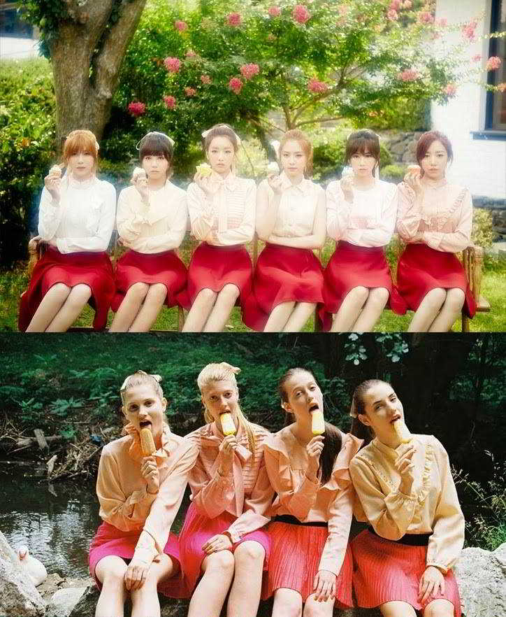 Yukarıda da görüldüğü gibi iki fotoğrafta da kızlar kırmızı tonlarında etekler, şeftali rengi üstler giymişler ve saçlarında kurdeleler takıyorlar. Aralarındaki fark ise A Pink tatlı olarak kap kek ve kurabiye tercih ederken, editör fotoğraflarındaki kızlar dondurma yalıyorlar. Arka planın bahçe olması da ayrı bir ortak özellik.