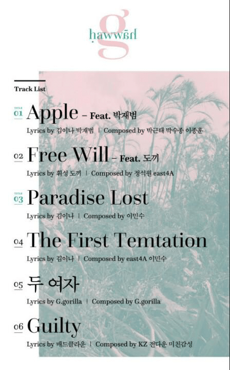 Ga In‘in albümünde yer alan şarkıların isimleri de açıklandı. (fotoğrafı üstte) Ayrıca Ga In’e albümünde eşlik edecek isimler de AOMG şirketinin CEO’su Jay Park, Illionaire’nin CEO’su Dok2, rapçi Mad Clown ve Wheesung olarak duyuruldu.