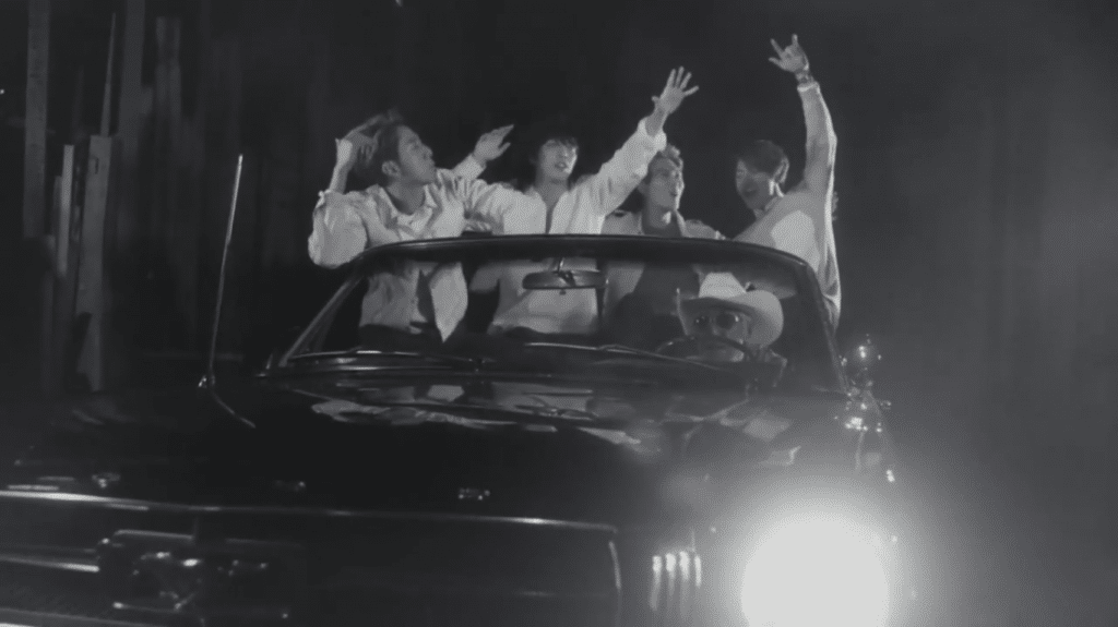 Güçlü sesleri ve müzik aletleriyle, beş kişilik bir grup halinde kendilerinden geçercesine rock müzik yapıyor ve saçları rüzgarda uçuşurken üstü açık bir arabaya biniyorlar.