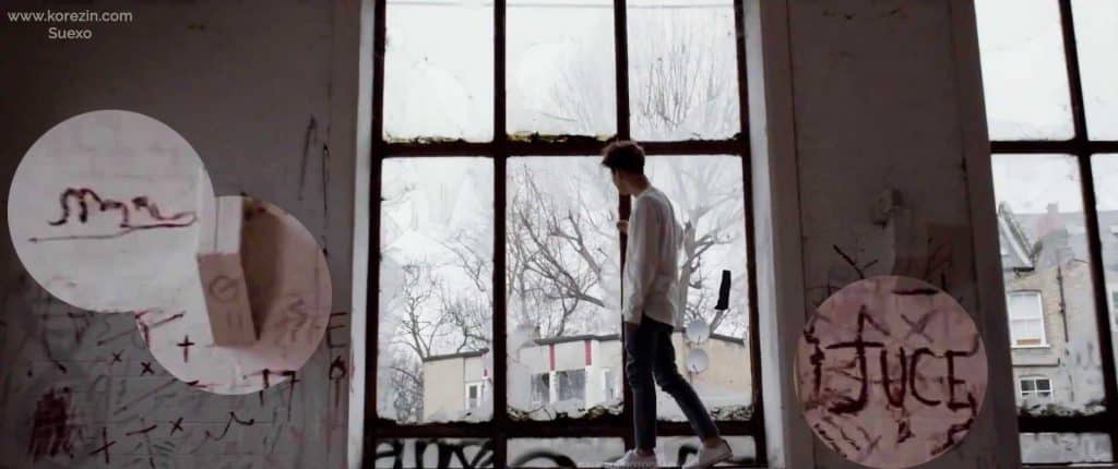 Camdan dışarı baktığı sahnede gözünüz duvardaki şekillere ve yazılara takılıyor. Bunlarda da bir mesaj olabileceğini düşünüyorsunuz. Ve dikkatinizi SM Entertainment’ın imzasına benzeyen şeklin yanındaki bir şey çekiyor. Duvarın üzerinde garip çıkıntıya 2’yi gösteren bir saatin çizildiğini görüyorsunuz. Hemen altında da romen rakamlarıyla “2” yazıyor. Sol tarafta ise “Juce” ya da “Tuce” ne olduğunu anlayamadığınız bir kelime görüyorsunuz.