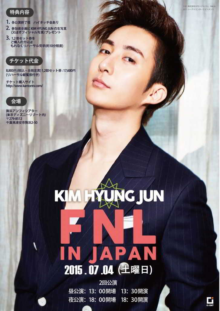 SS501 üyesi Kim Hyung Jun; bu yaz,Japonya’da bir etkinlik gerçekleştirecek.” Fan Night Live (FNL) ” hayran buluşması-konserinin ikinci ayağı olacak olan bu etkinlik; temmuz ayında,Tokyo’da birçok Japon hayranı bir araya getirecek.Bu etkinlikte,hem hayranları ile buluşacak hem yeni şarkısını ilk kez söyleyecek hem de sürprizler ile sahneye çıkacak olan Hyung Jun; hayranları ile oldukça eğlenceli zaman geçirecek.
