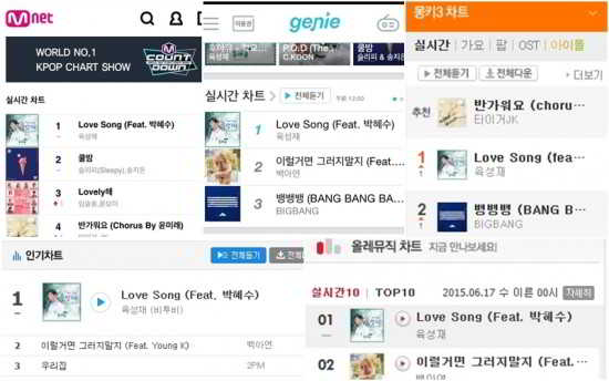 Sungjae’nin ‘School 2015’ için söylediği ‘Love Song’ OST´u Mnet, Soribada, Genie, Olleh Music, ve Monkey3 olmak üzere beş farklı gerçek zamanlı müzik listesinde ilk sıraya yerleşti.