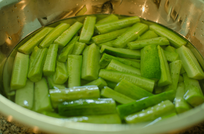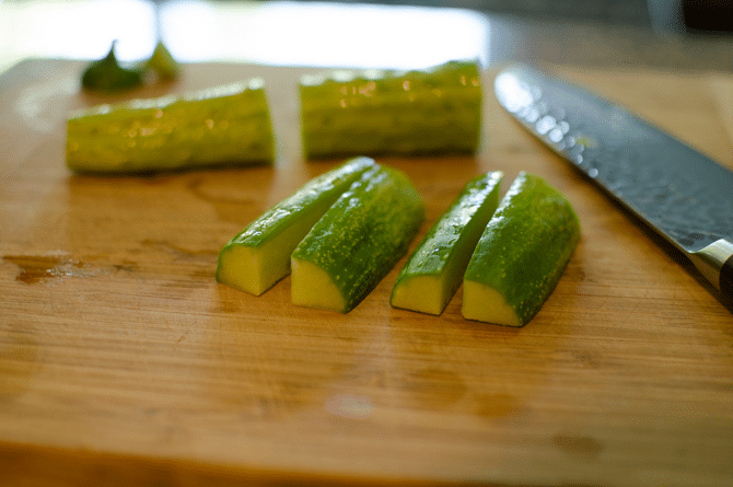 Ortadan ikiye keserek ayırdığınız salatalıkları kalın ve kısa dilimler şeklinde doğrayabilirsiniz.