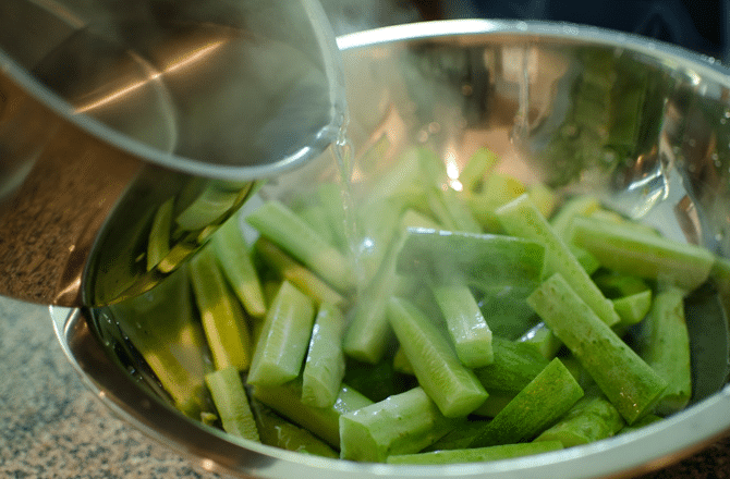 Salatalıkları üzerine eklediğiniz kaynar su içerisinde tam olarak 30 dakika kadar bekletin.