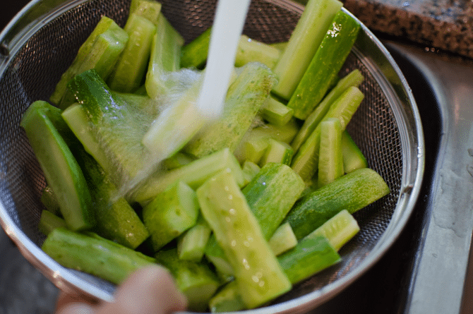 Daha sonra salatalıkları çeşmeden akan suyun altında yalnızca bir defa gezdirin ve üzerindeki suyun süzülmesi için bir kenarda bekletin.