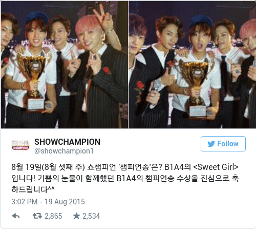Show Champion dün, ” 19 Ağustos’ un (Ağustos’ un 3. haftasının) Show Champion kazananı ‘Sweet Girl’ ile B1A4! Biz, mutluluk gözyaşları dökerek kupayı kazanan B1A4 grubunu şampiyon şarkıları Sweet Girl ile TEBRİK Ediyoruz.” şeklinde bir tweet paylaştı.