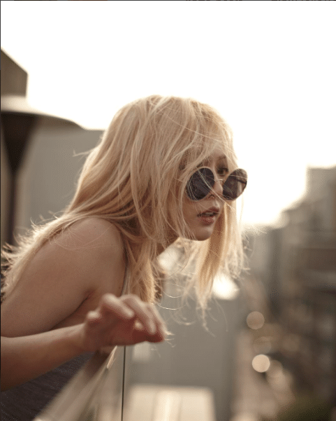 Kendisie bşr moda ikonu olarak çekimde morumsu yuvarlak bir güneş gözlüğü ve yular bir sütyen giydi.