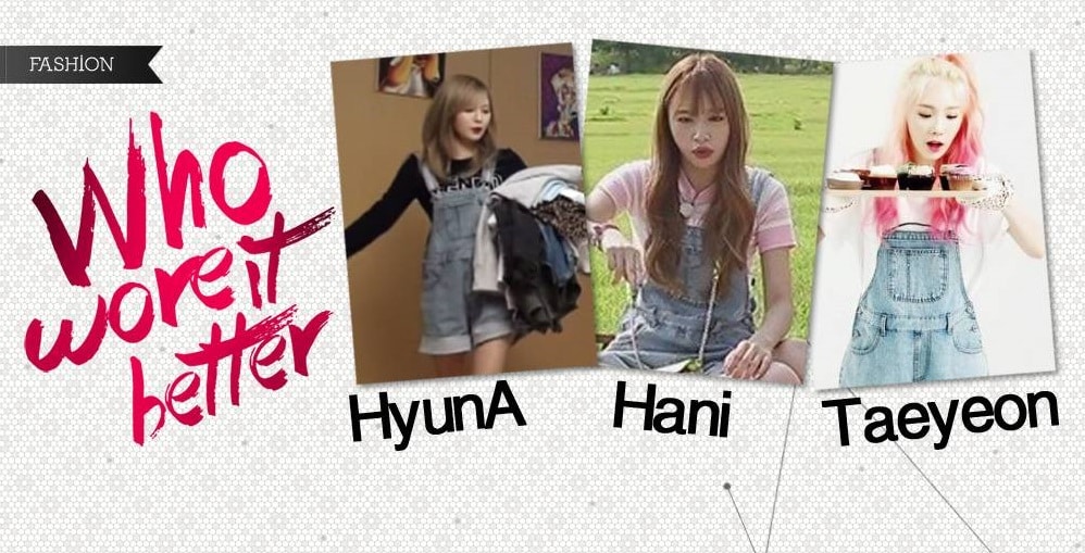 4Minute kızlarından HyunA ise bir videoda,daha önceden Taeyeon’un beyaz tişört üzerine saçlarını tepeden toplayarak giydiği tulumu,siyah gömleğiyle basit bir şekilde kombine ederek giydi.