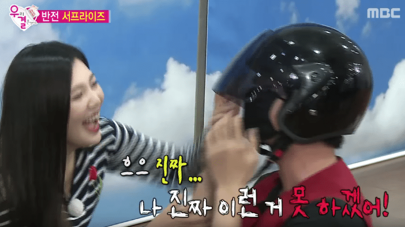 Sungjae daha sonra tavuk teslimatçısı olarak kendini kamufle etti ve SM binasında Red Velvet’in toplandığı ünlü bulut alıştırma odasında geldi.Onlar hızla onun kim olduğunu keşfettiği için kılık değiştirmesi işe yaramadı.