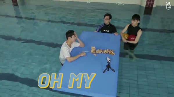 Üyeler bu bölümde önce havuz jengası oynadılar. Şöyle ki havuza girip 30 saniye içinde üst üste dizili tahtaları yıkmadan bir blok çekmeleri gerekiyordu. Tabii bu oyunda çok eğlenceli dakikalar yaşandı. Oyunun talihsiz üyeleri Jin, V ve J-Hope oldu.