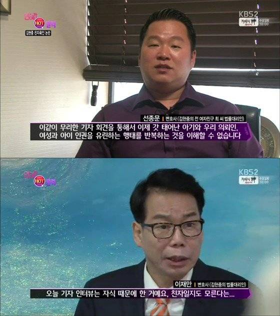 Kim Hyun Joong’un avukatının basın toplantısı düzenlemesi ve Kim Hyun Joong’un mektubunu okumasının üzerinden birkaç gün geçti. Bayan Choi’nin avukatı ‘Entertainment Relay’ programına bir röportaj verdi ve “Bizler neden onun (KHJ’un) gereksiz bir basın toplantısı düzenleyerek bebeğin ve onun (Bayan Choi’nin) haklarına saygısızlık ettiğini anlamıyoruz. Bizler DNA testini üçü bir aradayken yaptırmak istedik ama o reddetti. O bebeğini de mi görmek istemiyor?” dedi.