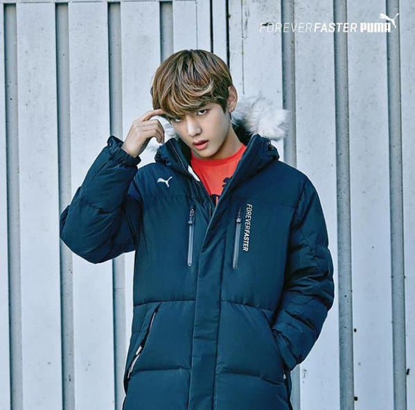 V, PUMA kıyafetleri içerisinde çok sevimli görünüyor ve insan kıyafetlerin ne kadar güzel olduğunu düşünmeden edemiyor.