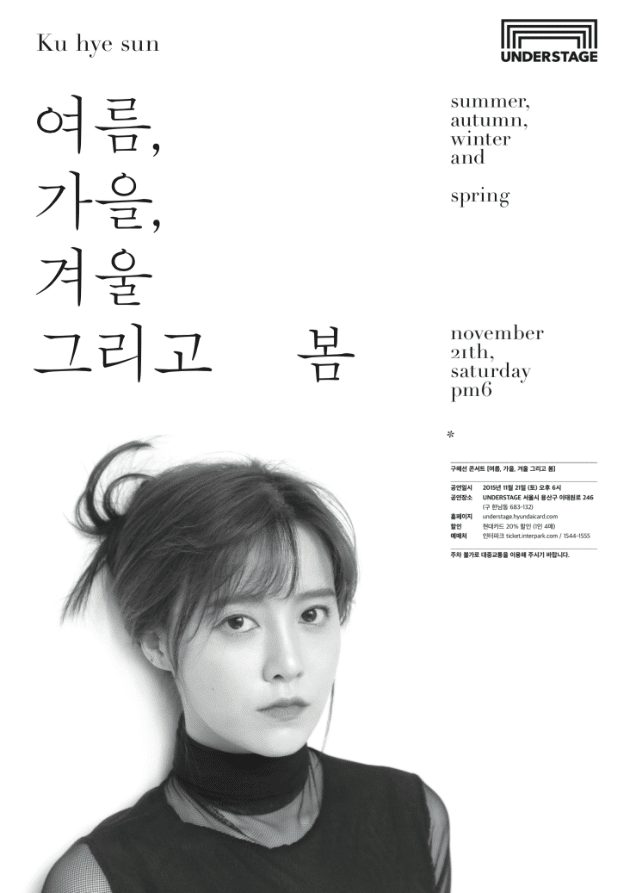 Ku Hye Sun ve Understage ortak çalışması olan “Summer, Fall, Winter and Spring” konseri 21 Kasım 2015 Saat 6’da Itaewon’da gerçekleşecek. Ku Hye Sun bir müzisyen, ressam ve yazar olarak kişisel deneyimlerini bu konserle birlikte bir kez daha hayranlarıyla paylaşmış olacak.