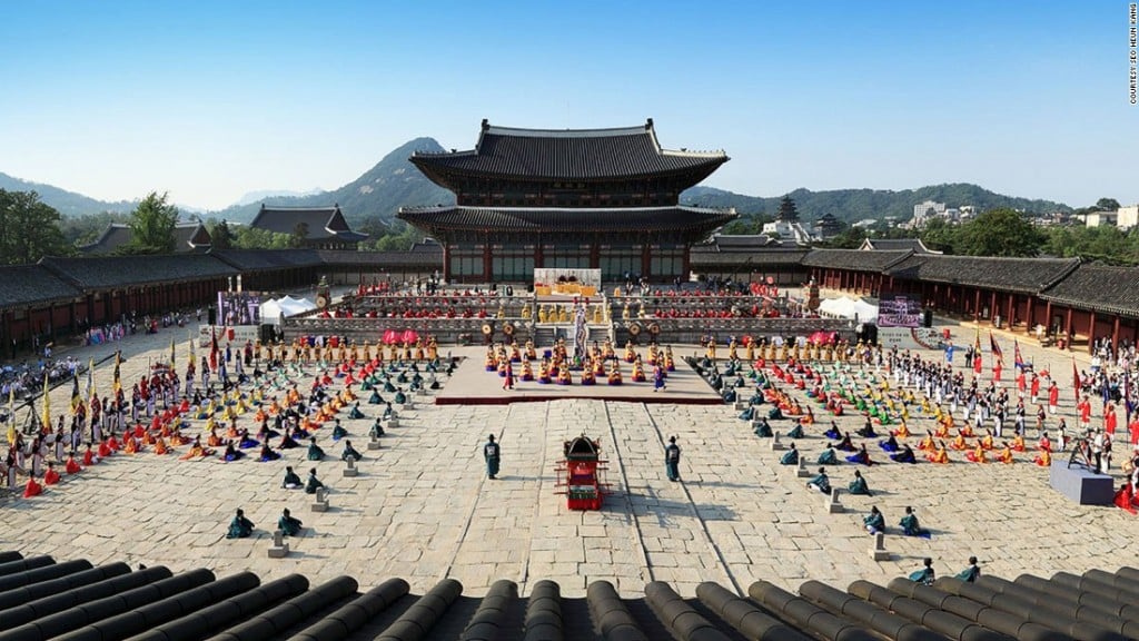 Joseon Hanedanlığı döneminde inşa edilen saray ülkenin en önemli tarihi değerlerinden birisidir.Aşağıda yer alan fotoğrafta kralın karşılama töreni anlatılıyor.145 yılında Fransız ordusunun saldırısına uğramıştır.