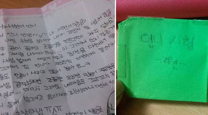Nam Ji Hyun’un ablası 11 Kasım’da Facebook’ta kardeşinin yazdığı mektupu şu sözlerle paylaştı, “Ji Hyun’un benim için yazdığı bu mektup üniversitesi sınavımdan bir gün önce 11 Kasım 2009’a ait. ” Fotoğtafta Ji Hyun’un kardeşine en iyisini yapmasını yazdığı destek mektubunu okuyabilirsiniz.