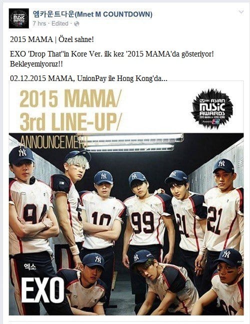 ‘2015 Mama’da bir sürü müthiş özel sahneler olacağı 30 Kasım tarihinde belli oldu, Mnet’in ‘M! Geri Sayımı‘ Facebook Sayfası, EXO hayranlarının sevgisini devamlı kazanmak için özel bir sahne hazırladığını duyurdu.