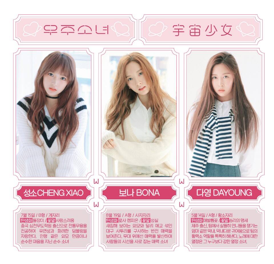 10 Aralık günü Cosmic Girls grubunun üç üyesinin profil fotoğrafı ve kısa tanıtımları resmi Facebook sayfalarında yayınlandı.