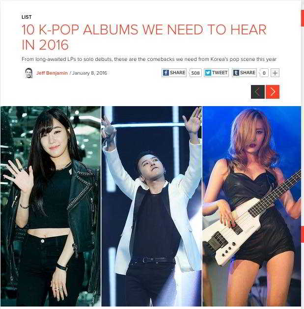 Fuse tarafından hazırlanan “2016 Yılında Dinlenmek İstenilen 10 K-Pop Albümü” listesinde bu senenin en çok beklenen En İyi 10 listesinde geri dönüşler ve çıkış şarkıları sıralanıyor.