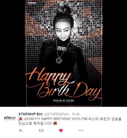 Starship Entertainment’te resmi Twitter hesapları üzerinden Hyolyn’in doğum gününü kutladı.