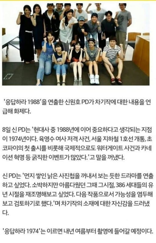 “1988’den sonra, 1974’ün tarihimiz açısından önemli bir yıl olduğunu düşünüyorum. Yook Young Soo’nun düşüşü ve bir sürü devrimci olay yaşandı. Seul metrosu açıldı, Water Gate olayı yaşandı ve bunun gibi daha bir sürü önemli şey. Ben eski ve tozlanmış fotoğraflarıma bakınca bu yılın dizisini çekmek istiyorum. Basit ama eski güzel günler, ben o jenerasyonun gençlerini gözler önüne sermek istiyorum. Bir dahaki projemizin bu olacağını düşünüyoruz.”