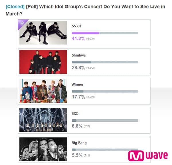 Shinhwa,% 28,8 oyla ikinci ve Winner ise % 17,7 oyla üçüncü olarak anketi tamamladı …