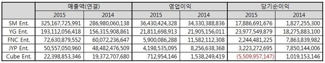 YG 23.9 billion won >> SM 17.8 billion won >>>>>> JYP 3.2 billion won > FNC 2.2 billion won >>>>>>>>>>> Cube -5.5 billion won