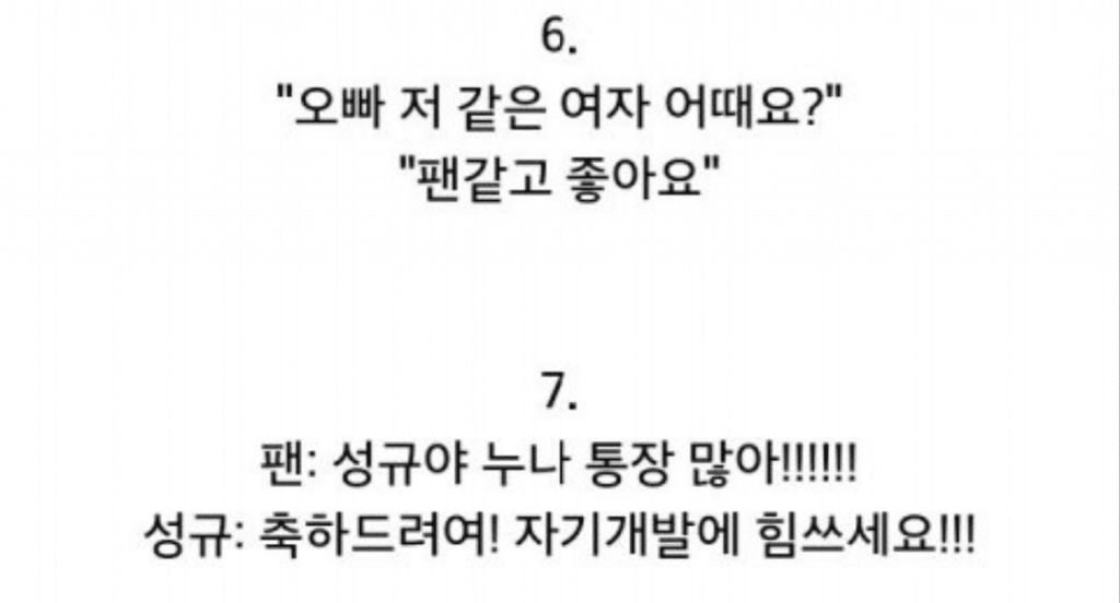 Birisi INFINITE imza gününe gitti ve Sunggyu’ya, “Oppa, gelecekte eşin olacağım, o yüzden bana güzelce bak.” dedi ve Sunggyu, “Gelecek hakkında tek başına karar veremezsin^^” dedi.
