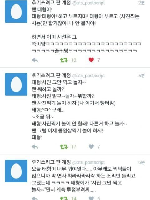 Bugün Taehyung çok tatlıydı… Fotoğraf çeken bir sürü insan vardı ve sadece kamera sesi duyabilirdiniz ㅋㅋㅋㅋㅋㅋㅋㅋ Ve her seferinde Taehyung, “Hadi fotoğraf çekmeyelim ve oynayalım~” dedi, hayranlar söylenmeye başladı….
