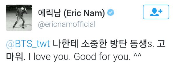 Eric Nam’da bu tweeti karşılıksız bırakmadı. “Benim için değerli küçük kardeşlerim olan Bangtan’a. Teşekkürler. Sizi seviyorum. Good for you (İyi ettiniz). ^^”