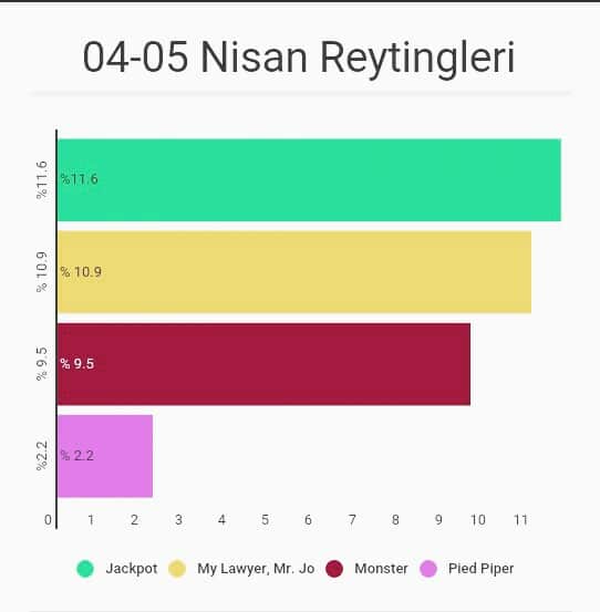 Geçtiğimiz hafta ilk bölümüyle yayımlanan SBS kanalında yayımlan tarihi dizi Jackpot bu hafta Pazartesi yayımlanan 3. bölümünde % 11.6 Salı günleri yayımlanan 4. bölümünde % 9.5 alarak Pazartesi günü reytinglerde birinci olurken Salı günü ikinci oldu.