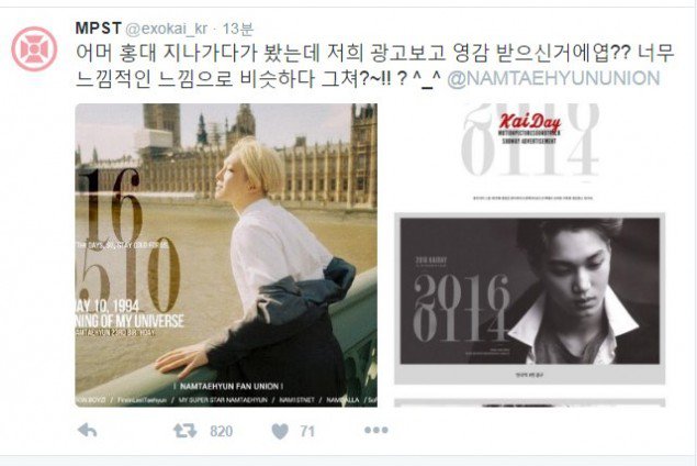 Kai’nin hayran kulübünün yöneticisi 10 Mayıs‘ta ; ” Aman Tanrım.Hongdae’den geçerken [Nam Tae Hyun’un posteri ] gördüm; bizim posterimizden mi ilham aldınız ?? Benzerlikler var gibi görünüyor, değil mi ?~!! ^_^” yazarak olayı Twitter adresinden duyurdu.