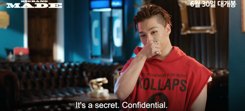 Videoda konuşmaya başlayan Taeyang’ın ilk sözü “Bu bir sır. Gizli.” dedi. Yüzündeki ifade “Hayır! Size söyleyemem!” der gibiydi.